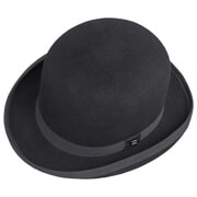 Bühnenrequisite, Uniforms- oder Bräutigamshut, Kultobjekt, Reiterhut, Accessoire für Film und Zirkus, zum eleganten Anzug und selbst zur stonewashed Jeans - der abgerundete Hut mit aufgestelltem Rand und Ripsfutterband ist ein Klassiker.